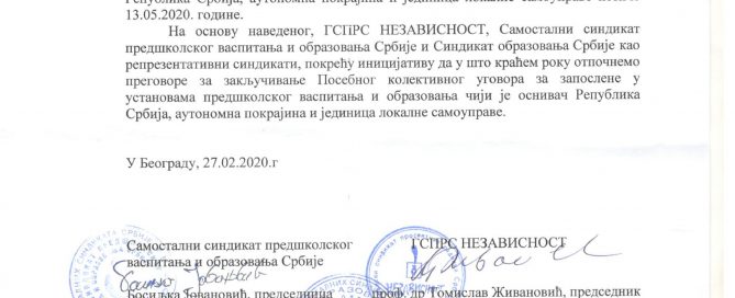 У петак су у Влади Републике Србије одржани преговори репрезентативних синдиката запосленихи у просвети са председницом Владе РС и Министром просвете, науке и технолошког развоја са сарадницима. Састанак је заказан на основу захтева за преговоре који су упутила три репрезентативна синдиката запослених у просвети. Најважнији захтев, репрезентативних синдиката, је био кориговање коефицијената до примене платних разреда. Председница Владе је била присутна једва пола сата, а тема је, након две и по године од последњег сусрета, било много. Нагомилани проблеми се не решавају.