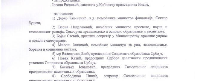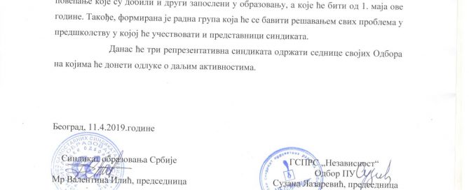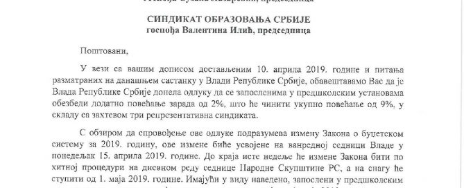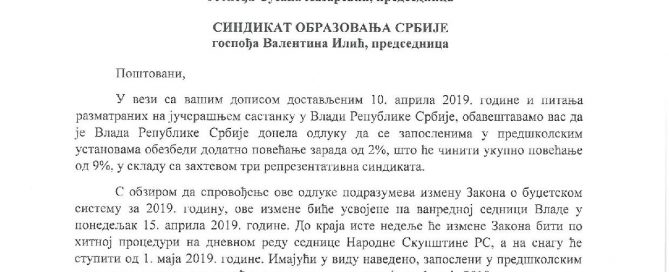 Представници репрезентативних синдиката запослених у предшколским установама на састанку су изнели захтеве: за изједначавање плате запосленима у предшколским установама у складу са Законом о предшколском васпитању и образовању („Сл. гласник РС“, бр. 18/2010, 101/2017, 10/2018), за формирање међуресорне Радне групе и решавање проблема у предшколским установама до септембра ове године.