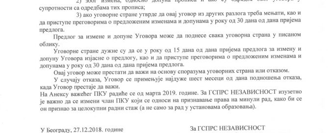 Представници ГСПРС НЕЗАВИСНОСТ (Ружица Тодић Брдарић и Срђан Словић) су истакли да се многе одредбе постојећег ПКУ не примењују (трошкови превоза, рад Комисије за тумачење одредаба ПКУ, заштита одређених категорија…) и да уколико постоји добра воља друге стране има сасвим довољно времена (до 05.03.2019. године) да се спорни чланови додатно разјасне.