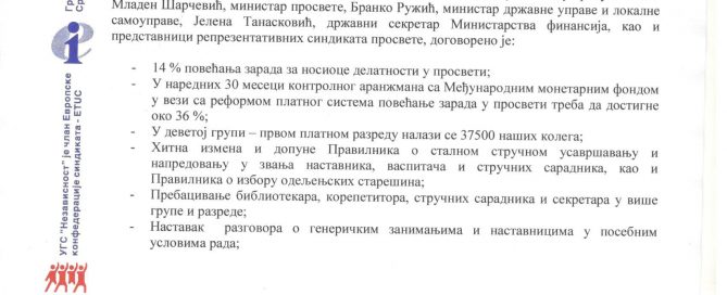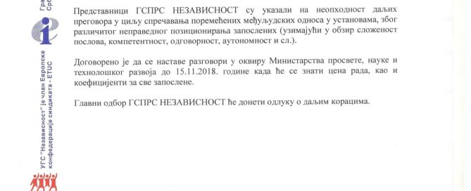 Упркос изјавама првог човека српске просвете да је наш штрајк био преурањен, дакле непотребан, сада је очигледно да смо управо тако изборили знатно више него што нам је власт предвидела. Али, прекид штрајка само је прилика да се пажљиво и одговорно посветимо корекцијама унутар платних група и разреда, изради правилника, као и праћењу реализације договореног. Много је још посла пред нама, али, само захваљујући вама, сада можемо да планирамо и даље кораке.