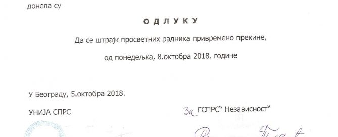 Органи сва четири репрезентативна синдиката су донели одлуку о привременом прекиду штрајка.
