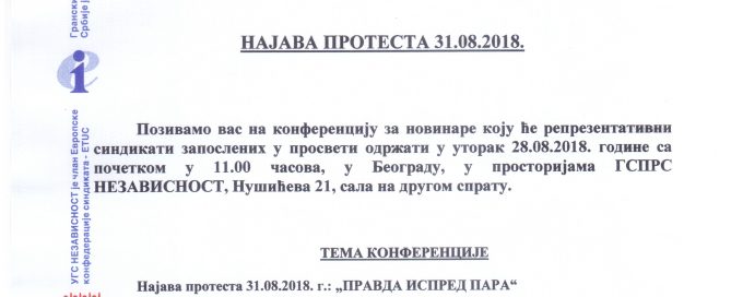 Протест под називом ,,Правда испред пара“ почеће у 12.00 сати испред Министарства просвете, где ће се од актуелног министра тражити да се као ,,највећи синдикалац лавовски бори“ заједно са нама против неправде која нам је нанета смештањем у осму платну групу. Затим, у протестној шетњи идемо до Владе Србије и, коначно, до Министарства државне управе и локалне самоуправе, у Бирчаниновој улици.