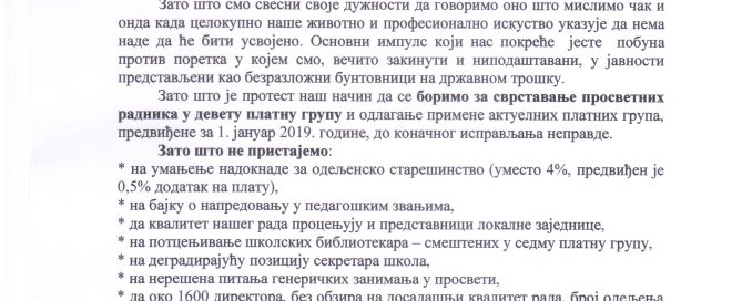 Главни наши захтеви су: померање запослених у просвети у девету платну групу и одлагање примене неправедних платних група, предвиђене за 1. јануар 2019. године.