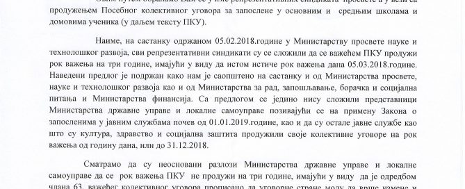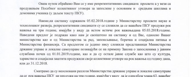 Имајући на уму да су представници Министарства просвете, науке и технолошког развоја, Министарства за рад, запошљавање, борачка и социјална питања, као и Министарства финансија прихватили заједнички предлог четири репрезентативна синдиката просвете о продужењу рока важења актуелног ПКУ («Службени гласник РС» бр. 21/2015.) на три године, апелујемо на Вас да као председница Владе Републике Србије својим ставом подржите потписивање Споразума о продужењу рока важења Посебног колективног уговора за запослене у основним и средњим школама и домовима ученика.