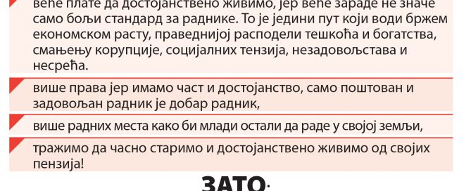 – Мислим да овога пута око нужности повећања минималне цене рада постоји, из разних разлога, готово општа сагласност. Но само повећање „минималца“ без раста зарада и, наравно раста производње, води само прерасподели у којој ћемо сутра сви радити за између двеста и осамсто евра. Је ли просек од ни целих четиристо евра судбина намењена Србији? Је ли пензија од двеста-триста евра круна нечије каријере и деценијског рада? Треба ли због насталог стања и даље кажњавати запослене који пред претњом стечаја и губитка радног места оду у превремену пензију? Треба ли да млади раде на бедно плаћеним и несигурним пословима испод својих квалификација? Или рачун треба да коначно, бар онај политички, плате све владајуће гарнитуре које су нас довеле до стања раширеног сиромаштва у коме су неједнакости дупло веће од европског просека.