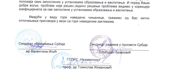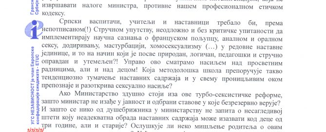 Из овог синдиката поручују: „Ако Министарство здушно стоји иза ове турбо-сексистичке реформе, зашто министар не изађе у јавност и одбрани ставове у које безрезервно верује? И зашто се нико од душебрижника у министарству не запита о несагледивој штети коју неадекватна обрада наставних садржаја може изазвати код деце од три године, али и старије? Ослушкује ли неко мишљење родитеља о овим пакетима сумњиве садржине? Хоћемо ли своју децу усмеравати да живот и стварност гледају параноично, превасходно из угла патологије? Хоћемо ли ми, просветни радници, бити одговорни и за превредновање традиције друштва у којем смо и сами поникли?“