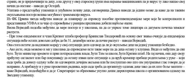 – Ако јесте, онда можемо и ми у школама да спроведемо исте такве мере па да деца остану у клупама. Види се међутим да сви ћуте. Ћути министар просвете и први потпредседник владе, ћути Тим за школе, ћути Кризни штаб. На тај начин, они дају своју прећутну сагласнот или бар покушавају да остану изван целе ситуације а да врућ кромпир пребаце родитељима у руке – који сада треба да донесу одлуку хоће ли одговорити дечијим жељама или ће послуштаи оно што им унутрашњи глас говори да је исправно. А пребацују и у руке просветних радника, који сада треба да организују одлазак деце тако да их што боље заштите – каже Војводић, подсећајући и да је Секретаријат за образовање упутио допис директорима школа о организованом одласку на Звездину утакмицу.