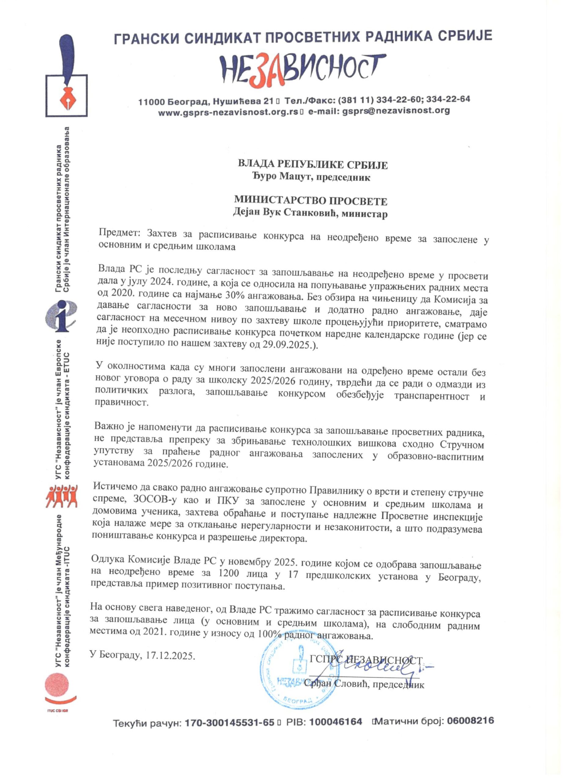 ДОПИС МИНИСТРУ И ПРЕМИЈЕРУ